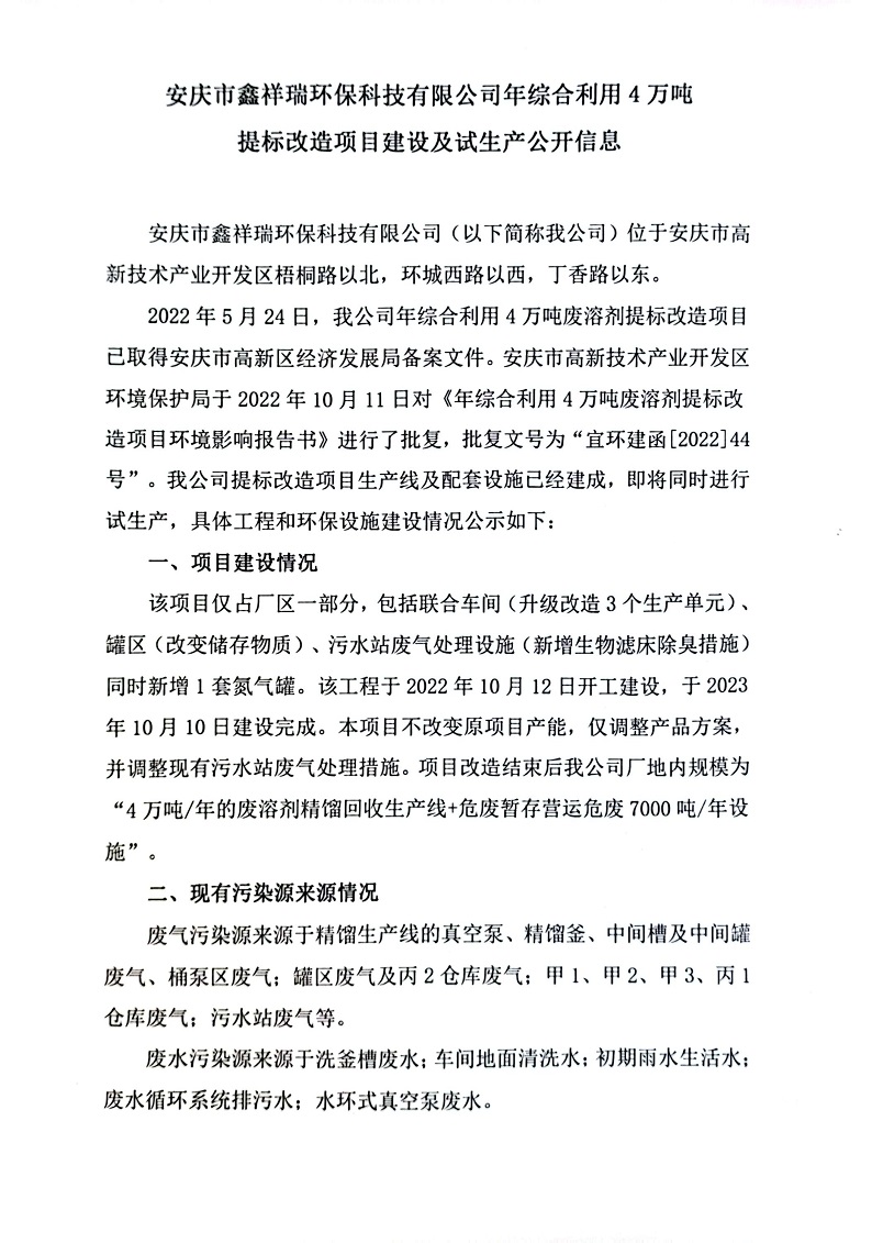 安慶市鑫祥瑞環(huán)??萍加邢薰灸昃C合利用4萬噸提標(biāo)改造項目建設(shè)及試生產(chǎn)公開信息